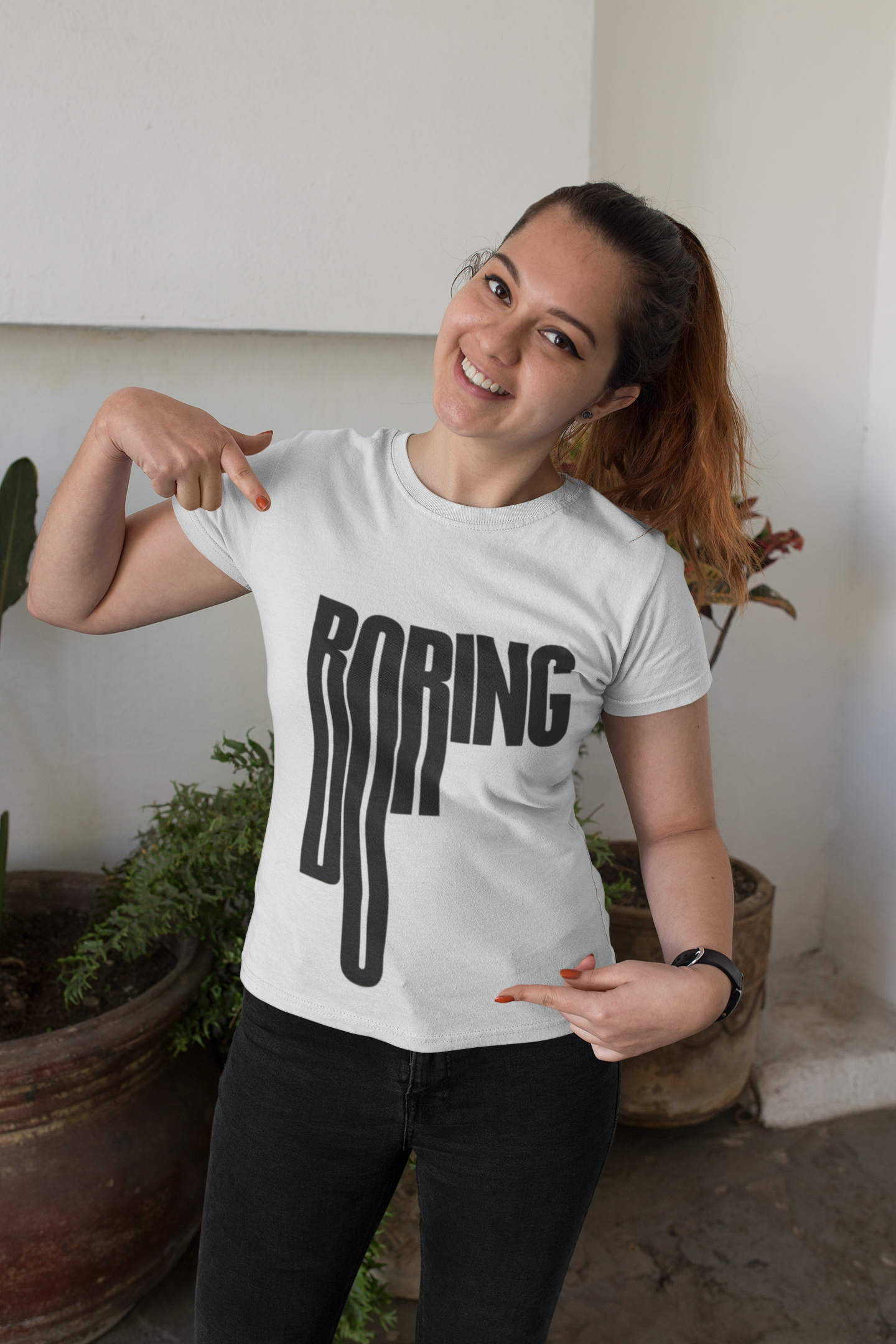 Redefine irony with this witty and eye-catching white T-shirt featuring a bold “BORING” text design that visually drips down the shirt. It's the perfect combo of minimalist style and clever graphic art. Whether you're making a sarcastic statement or just want something uniquely playful in your wardrobe, this tee is sure to turn heads and spark conversations.