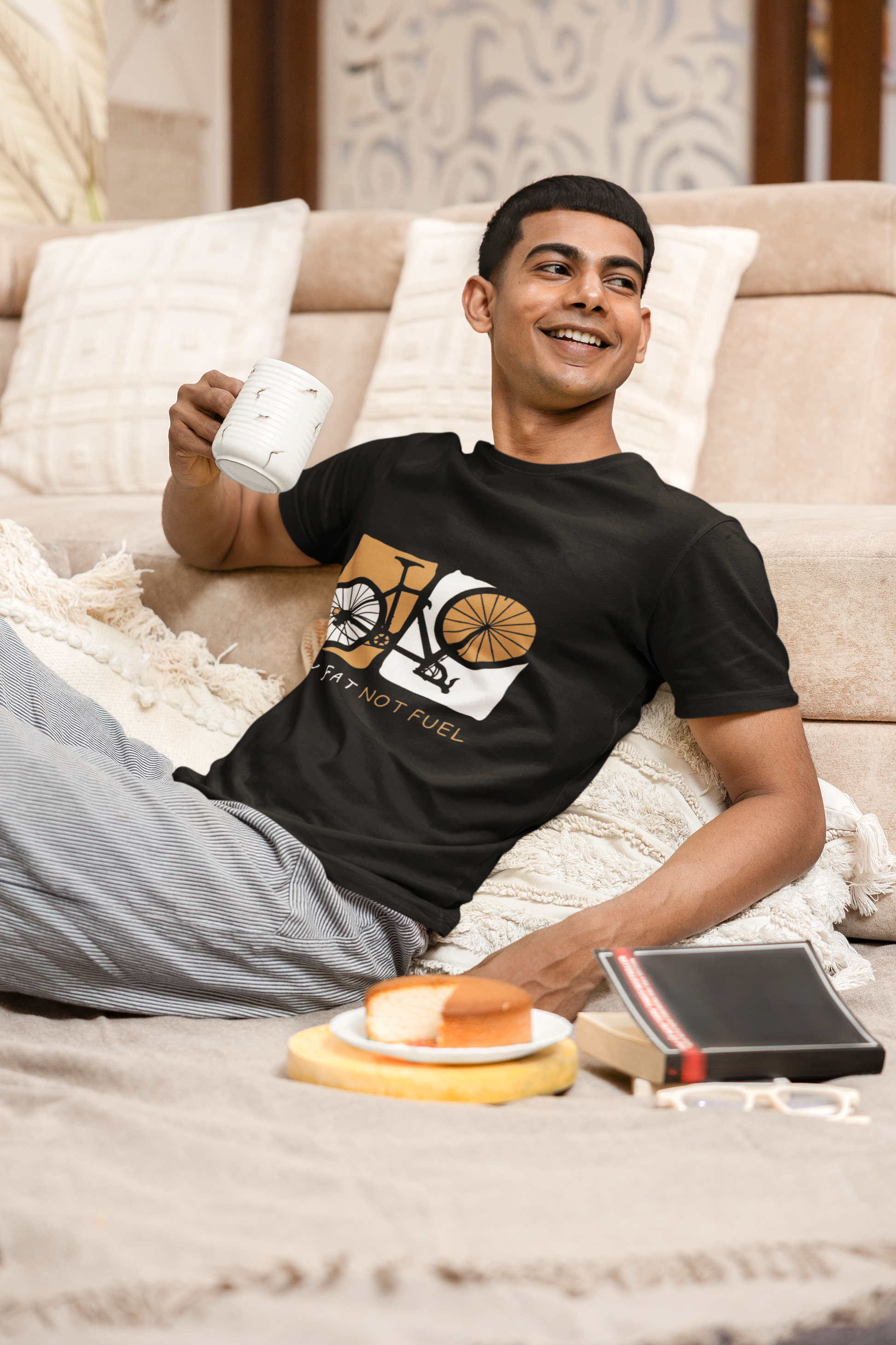 Make a bold statement with this eco-friendly and fitness-inspired black graphic T-shirt. Featuring a modern bicycle design with the motivational slogan “Burn Fat Not Fuel”, this tee is perfect for cycling enthusiasts, fitness lovers, and those who believe in sustainable living. The soft cotton blend ensures maximum comfort, whether you’re riding, working out, or just relaxing at home. A stylish choice that combines comfort, fitness, and awareness in one.
