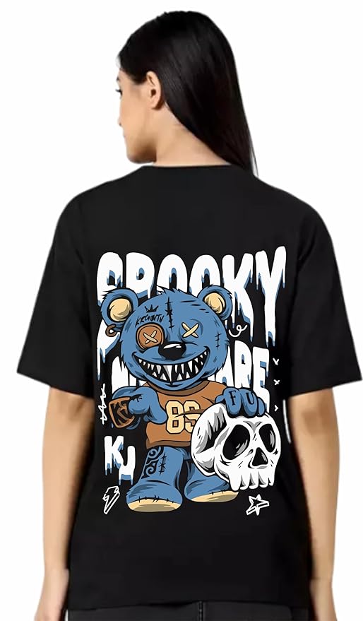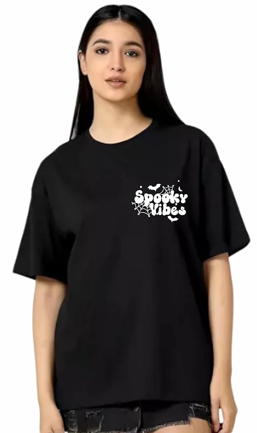 Get into the playful Halloween spirit with our Spooky Vibes graphic print oversized women’s t-shirt. Featuring a fun and edgy bear-and-skull artwork on the back and a cool “Spooky Vibes” logo on the front, this tee is perfect for girls who love quirky streetwear. Made from soft and breathable cotton fabric, it offers a relaxed fit and ultimate comfort for all-day wear. Pair it with jeans, shorts, or joggers for a bold and trendy look